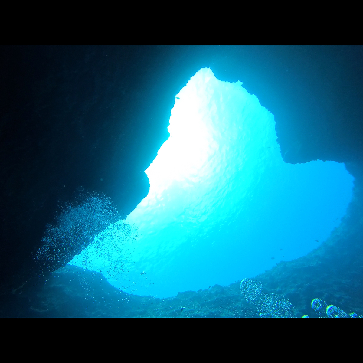 最初のポイントは、グアムを代表する「ブルーホール」。深度40mに達する縦穴で、今回は 37.5mまで潜降。下から見上げると光に照らされた穴が浮かび上がり、ハート型 に見える瞬間がありました。
